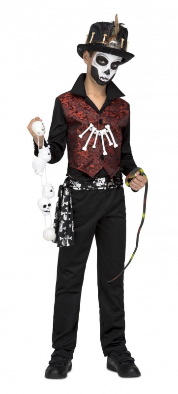 Součástí kostýmu na Halloween je košile, vesta, pásek, náhrdelník, náramek, had a lebky.