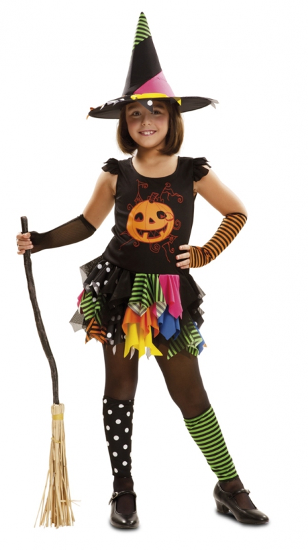 Součástí halloweenského kostýmu čarodějnice jsou šaty, rukavice, návleky na nohy a klobouk. Krátké černé šaty bez rukávů mají na hrudníku natištěnou velkou oranžovou dýni. Na ramenou jsou přišity krátké cípy černé látky. Sukně je sešitá z různobarevných kousků látky tvořící volánky. Kostým doplňuje jedna černá a druhá černooranžová pruhovaná rukavice bez prstů a návleky na nohy - jeden černý s bílými puntíky a druhý pruhovaný černozelený. Součástí kostýmu je i černý špičatý klobouk zdobený barevnými kousky látky.