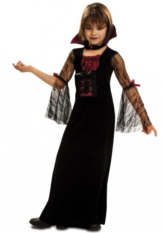 Součástí kostýmu jsou dlouhé černé šaty doplněné červenou nařasenou vsadkou na hrudníku a černým šněrováním s kovovými kroužky. Rozšířené rukávy jsou z průhledné černé krajky u lokte zdobeny červenou mašličkou. Velký stojací černočervený límec tvoří na krku ozdobný obojek s červeným kamínkem.