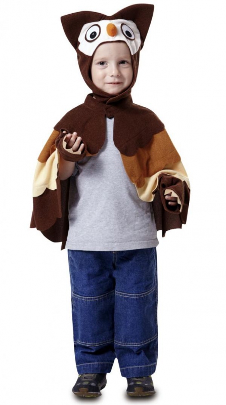 Součástí kostýmu je plášť, rukavice a čepice. Hnědý plášť je na suchý zip pod krkem. 4 široké pruhy na plášti jsou různých hnědých odstínů a jsou vrstvené na sebe. Tmavohnědé rukavice bez prstů mají přišit cípatý proužek světlejší hnědé tvořící dojem drápků. Tmavohnědá čepice je na suchý zip a má uši, velké soví oči a oranžový zobáček.