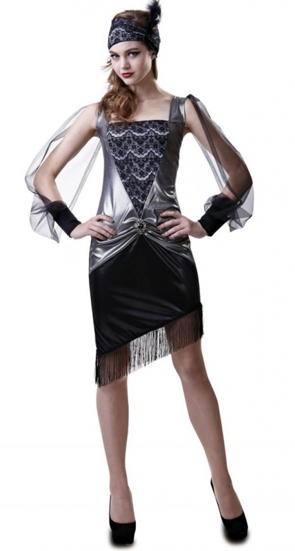 Součástí kostýmu jsou krátké černé šaty se šikmo střiženou sukní zdobenou černými třásněmi. Vrchní díl je z šedé lesklé látky pod břichem nařasený a ozdobený stříbrnou sponou s černým kamenem. Na hrudníku je velká vsadka pošitá černou krajkou. Dlouhé rukávy jsou celé z průhledné černé látky se širokou černou manžetou. Kostým doplňuje čelenka z lesklé šedé látky pošité černou krajkou a ozdobena černým pérem.