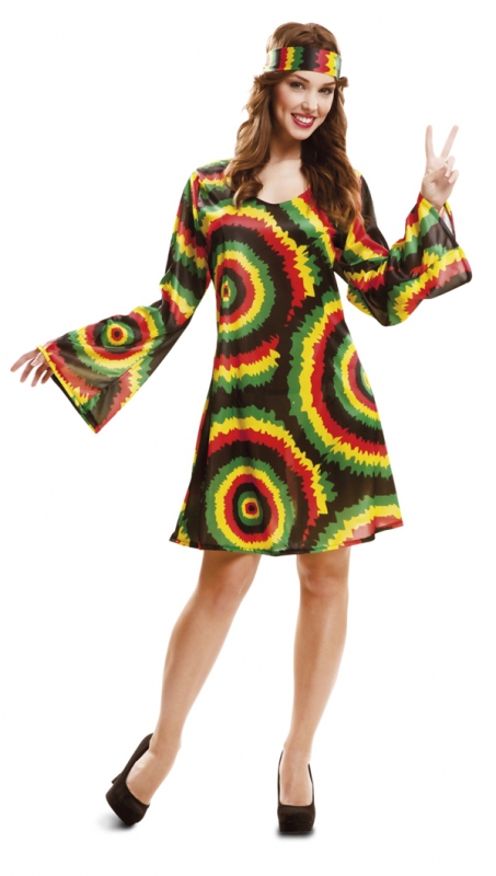 Součástí kostýmu je čelenka a šaty. Černé šaty s kulatým výstřihem a s dlouhými dole rozšířenými rukávy. Sukně je dole mírně rozšířená. Šaty jsou potištěny barevnými roztřepenými kolečky. Ve stejném designu je i čelenka.