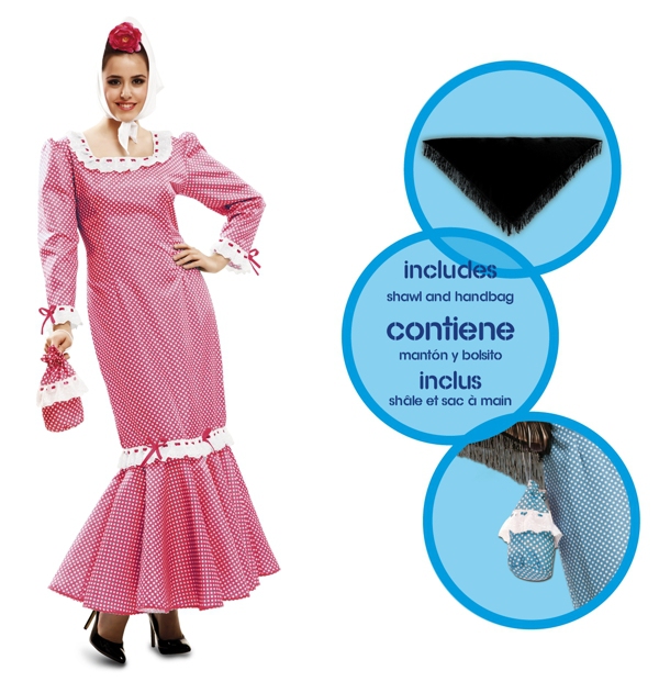 Součástí kostýmu je šátek na hlavu, kabelka, šátek a šaty. Dlouhé úzké růžové šaty s dlouhými rukávy jsou posety malými bílými puntíky. Nad koleny, kolem výstřihu a zápěstí jsou malé krajkové volánky provlečené růžovou stužkou. Na kolenou jsou dvě malé mašličky. Od kolen dolů je sukně rozšířená. Kostým doplňuje bílý šátek na hlavu, černý trojcípý šátek přes ramena s třásněmi a malá taštička do ruky ve stejném designu jako jsou šaty.