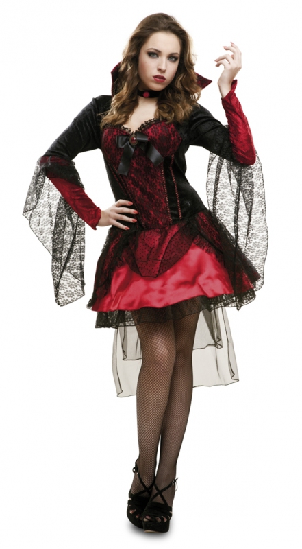 Součástí kostýmu jsou šaty s límcem. Krátké mini šaty mají černé dlouhé rukávy, které jsou od loktů dolů červené sametové. Spodní lem je do špičky a u loktů ve švu je přišit širší delší pruh průhledné černé látky se vzorem kytek. Na hrudníku je přišita na červeném podkladu černá průhledná krajka s ornamenty zdobená vlnitou červenou stužkou. Prsa jsou na horním lemu zdobená malým průhledným černým volánkem a uprostřed doplněna černou mašlí s ozdobným kamínkem. Červená sukně je na spodním lemu zdobená černým krajkovým volánkem. V pření části sukně je z černé průhledné krajky přišitá malá vlnka. Od ní dozadu vede černá průhledná sukně s ornamenty. V zadní části šatů jsou v pase přišity dva různě dlouhé průhledné černé volány. Kolem krku je velký červený stojací límec pošitý černou průhlendou krajkou se zapínáním, které je zdobené červeným kolečkem.