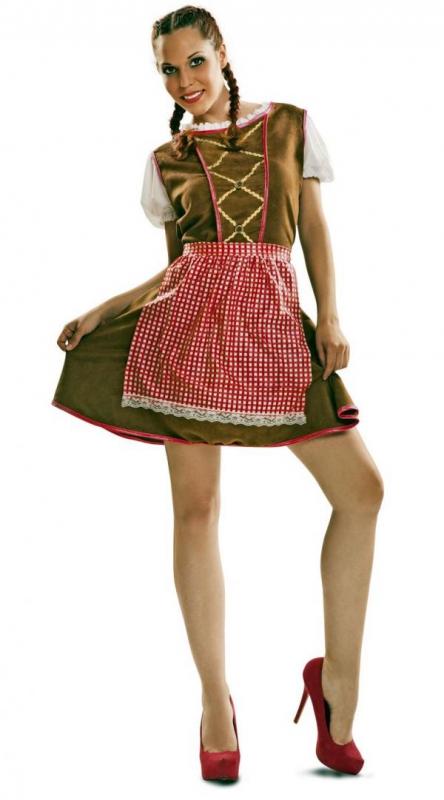 Součástí kostýmu je zástěra a šaty. Hnědé, červeně lemované šaty mají krátké nabírané bílé rukávy. Na hrudníku je červeně lemovaná vsadka se zlatou stuhou našitou do kříže a zdobenou knoflíky. U krku je malý bílý volánek. Kostým doplňuje červenobílá kostkovaná zástěra, která má na spodním lemu našitou bílou krajku.