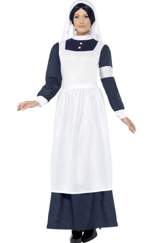 Součástí kostýmu jsou šaty a šátek. Dlouhé tmavomodré šaty s dlouhými rukávy. Manžety a stojací límeček jsou bílé. U krku jsou našity dva bílé knoflíky. Na šatech je přišita velká dlouhá bílá zástěra. Na levé ruce nad loktem je bílý pruh. Kostým doplňuje bílý šátek na hlavu.