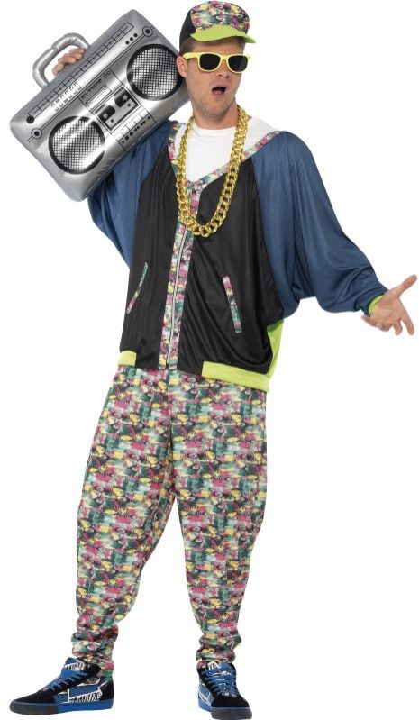 Součástí kostýmu je čepice, bunda a kalhoty. Černý žaket má velmi široké tmavomodré rukávy, které jsou zakončené úzkou neonově zelenou manžetou. Ve stejné barvě je i spodní lem žaketu. Na hrudníku je dlouhý zip, který je stejně jako velký výstřih lemovaný pestrobarevnou látkou. Ta je použita i na klopy kapes a na kalhoty, které mají velmi široké nohavice. Ty se ve spodní části zužují. Kostým doplňuje černá kšiltovka, jejíž přední část je také z pestrobarevné látky. Kšilt je neonově zelený.