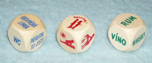 3 kostky 25 mm. Jedním hodem si můžete hodit co budete pít, kde budete souložit a rovnou i jaká poloha. 1. kostka: Obrázky poloh 2. kostka: fernet, pivo, víno, whisky, vodka a rum 3. kostka: příroda to jistí, kuchyňská linka, koupelna, pod mostem, wc a ložnice